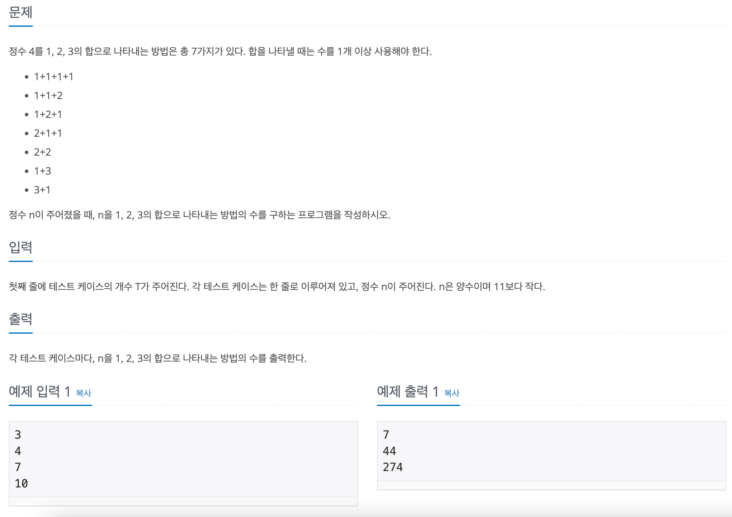 dp 1μ°¨μ λ°°μ΄μ μμ±νκ³ , dp[n] λ μ μ nμ 1,2,3 μ ν©μΌλ‘ λνλΌ μ μλ κ²½μ°μ μλ₯Ό μλ―Ένλ€.