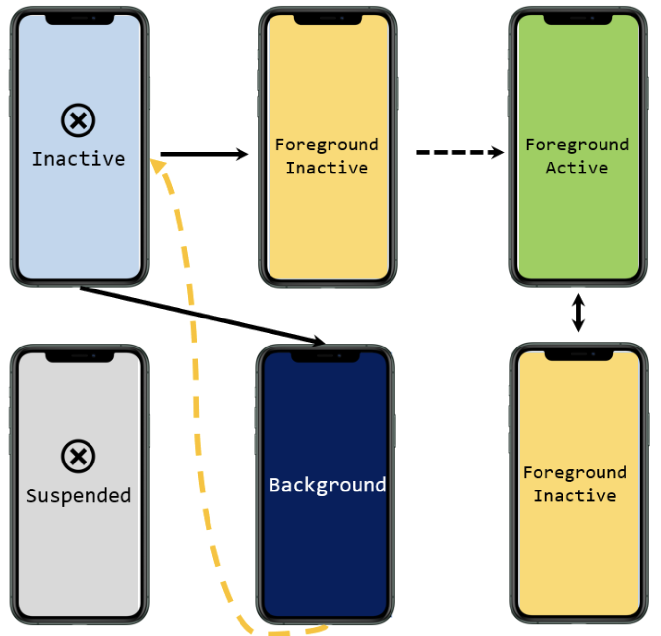 - Suspened : ์ฑ์ด ๋ฐฑ๊ทธ๋ผ์ด๋์ ์๊ณ ์คํ๋๋ ์ฝ๋๊ฐ ์๋ ์ํ