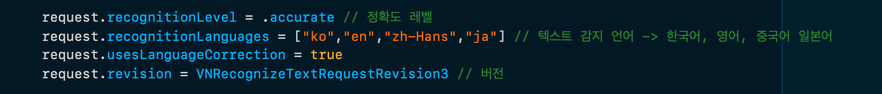 request.recognitionLevel = .accurate // ์ ํ๋ ๋ ๋ฒจ