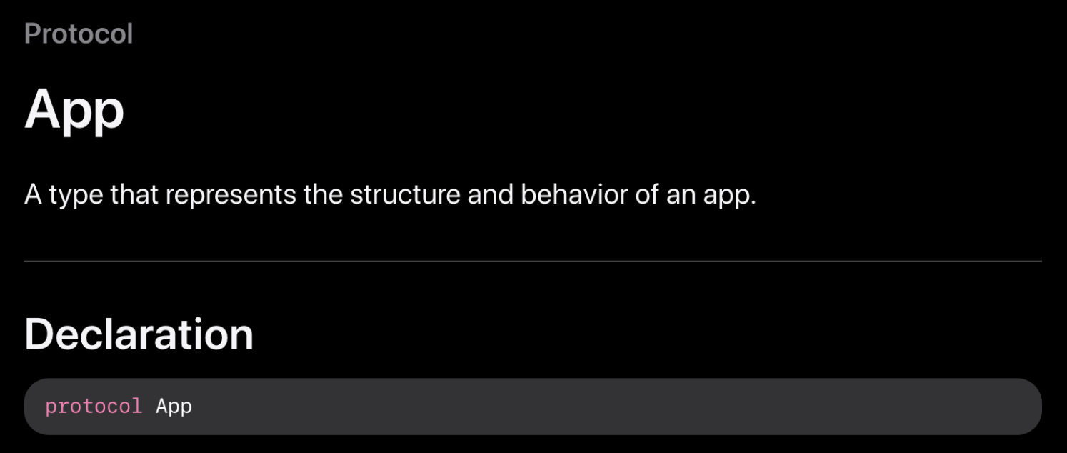์ ์ฝ๋์์ ๋ณด์ด๋ App ํ๋กํ ์ฝ ์์ฒด๊ฐ ์ฑ์ ๊ตฌ์ฑ์ ๋ด๋นํ๋ ๊ตฌ์กฐ์ฒด์ ํ๋กํ ์ฝ์ ์ง์ ํด์ฃผ์ด์ ์ฑ์ ์์(Presenting) ์ง์ ์ ์ ํด์ฃผ๋ ์ญํ ์ ํ๊ฒ ๋๋ค. ๋ํ @main์ ํตํ์ฌ ์ฑ์ด ์์๋๊ณ ๊ฐ์ฅ ๋จผ์ ๋ค์ด๊ฐ์ผํ๋ ๋ถ๋ถ์ ๋ช ์ํด์ฃผ๊ณ ์๊ธฐ ๋๋ฌธ์ AppDelegate๊ฐ ํ์ํ์ง ์๋ค.