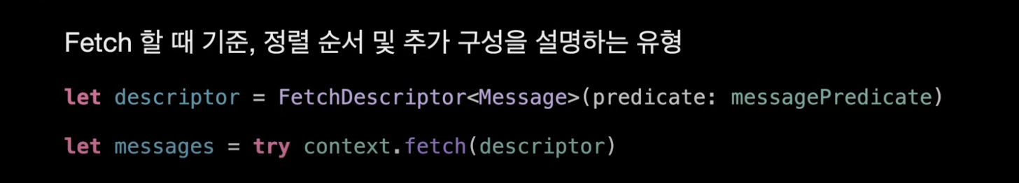 - FetchDescriptor : Fetch ํ ๋ ๊ธฐ์ค, ์ ๋ ฌ ์์ ๋ฐ ์ถ๊ฐ ๊ตฌ์ฑ์ ์ค๋ช ํ๋ ์ ํ
