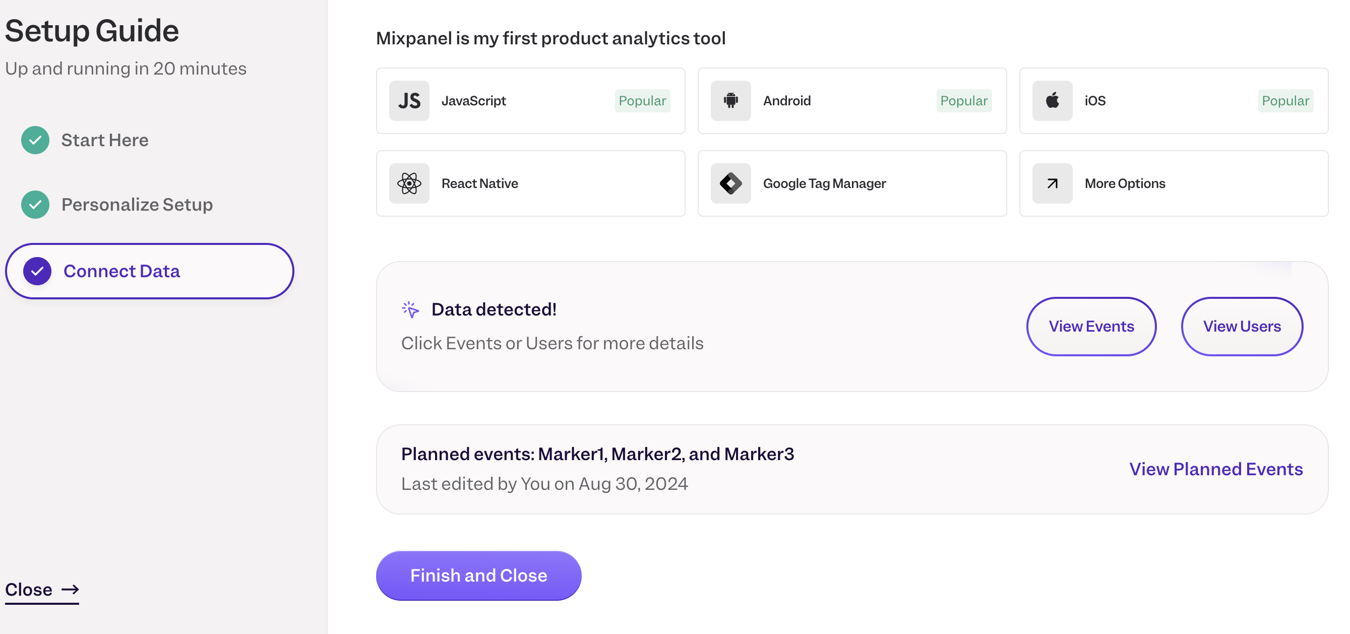 ์ ํ๋ฉด์ด ์๊น Mixpanel๋ง ์ธํ ํ ๋๋ Finish and Close๊ฐ ํ์ฑํ๊ฐ ์๋ ํ ๋ฐ,