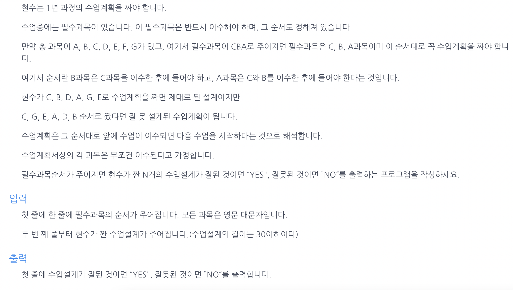 if(!Q.isEmpty()) return "NO"; // ๋น์ด์์ง์์ผ๋ฉด(ํ์๊ณผ๋ชฉ ๋ฃ์ง์์) "NO"๋ฆฌํด