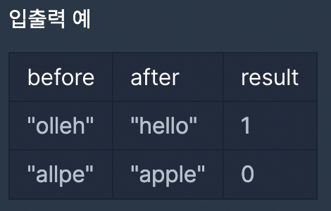 문자열 before와 after가 매개변수로 주어질 때, before의 순서를 바꾸어 after를 만들 수 있으면 1을, 만들 수 없으면 0을 return 하도록 solution 함수를 완성해보세요.