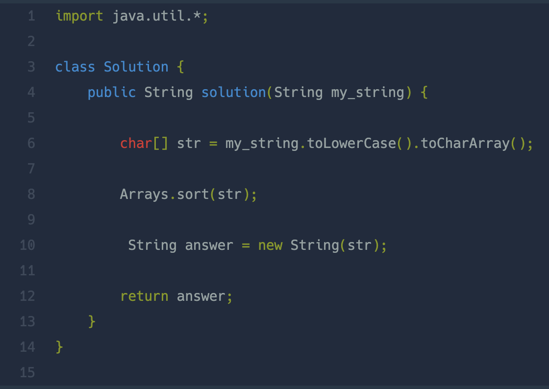 ์์ด ๋์๋ฌธ์๋ก ์ด๋ฃจ์ด์ง ๋ฌธ์์ด my_string์ด ๋งค๊ฐ๋ณ์๋ก ์ฃผ์ด์ง ๋, my_string์ ๋ชจ๋ ์๋ฌธ์๋ก ๋ฐ๊พธ๊ณ ์ํ๋ฒณ ์์๋๋ก ์ ๋ ฌํ ๋ฌธ์์ด์ return ํ๋๋ก solution ํจ์๋ฅผ ์์ฑํด๋ณด์ธ์.