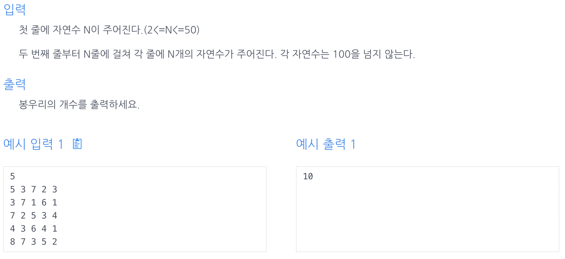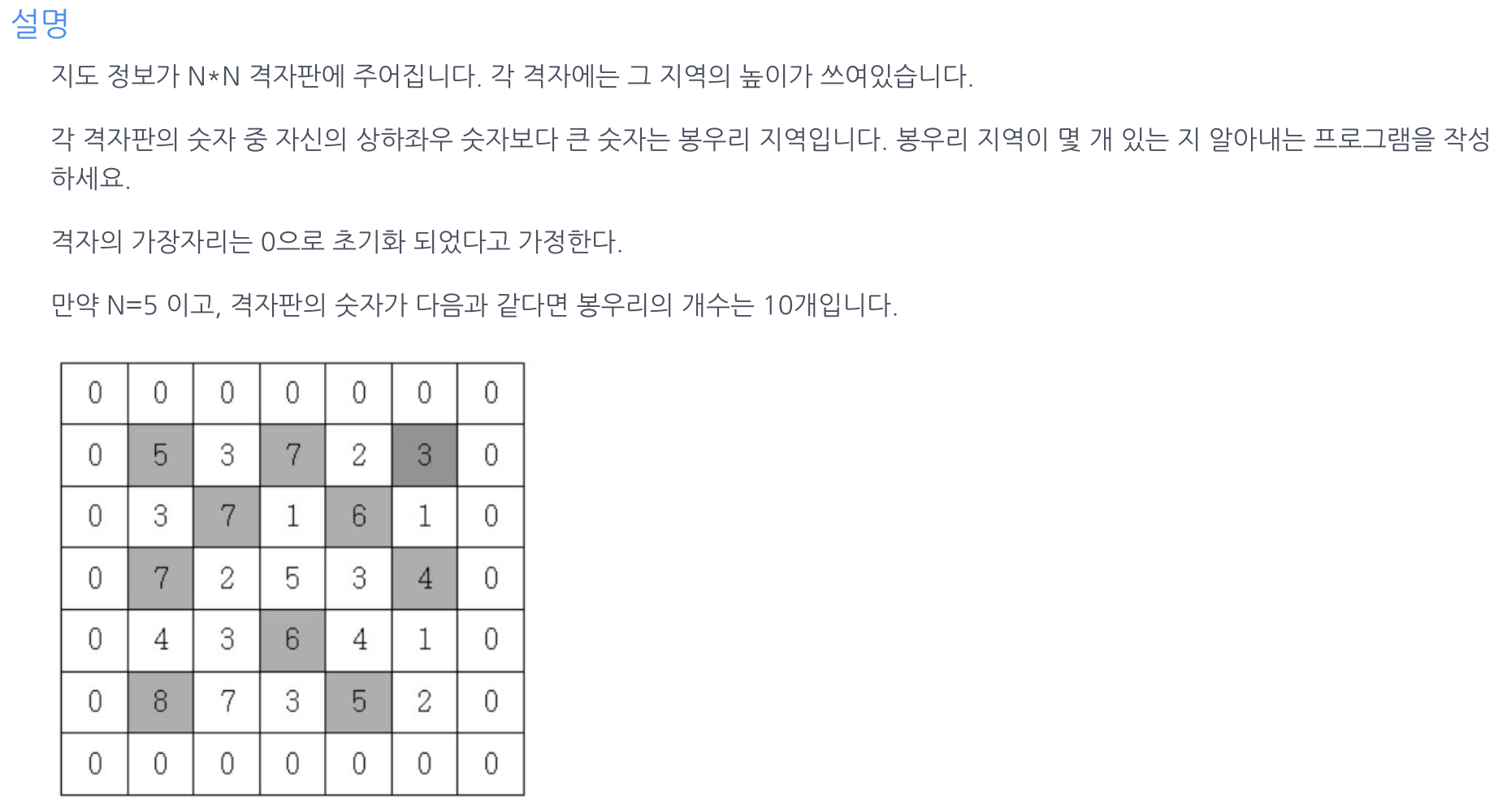 if(nx>=0 && nx<n && ny>=0 && ny<n && arr[nx][ny]>=arr[i][j]){ // ๊ฒฝ๊ณ์ ์ฒ๋ฆฌ