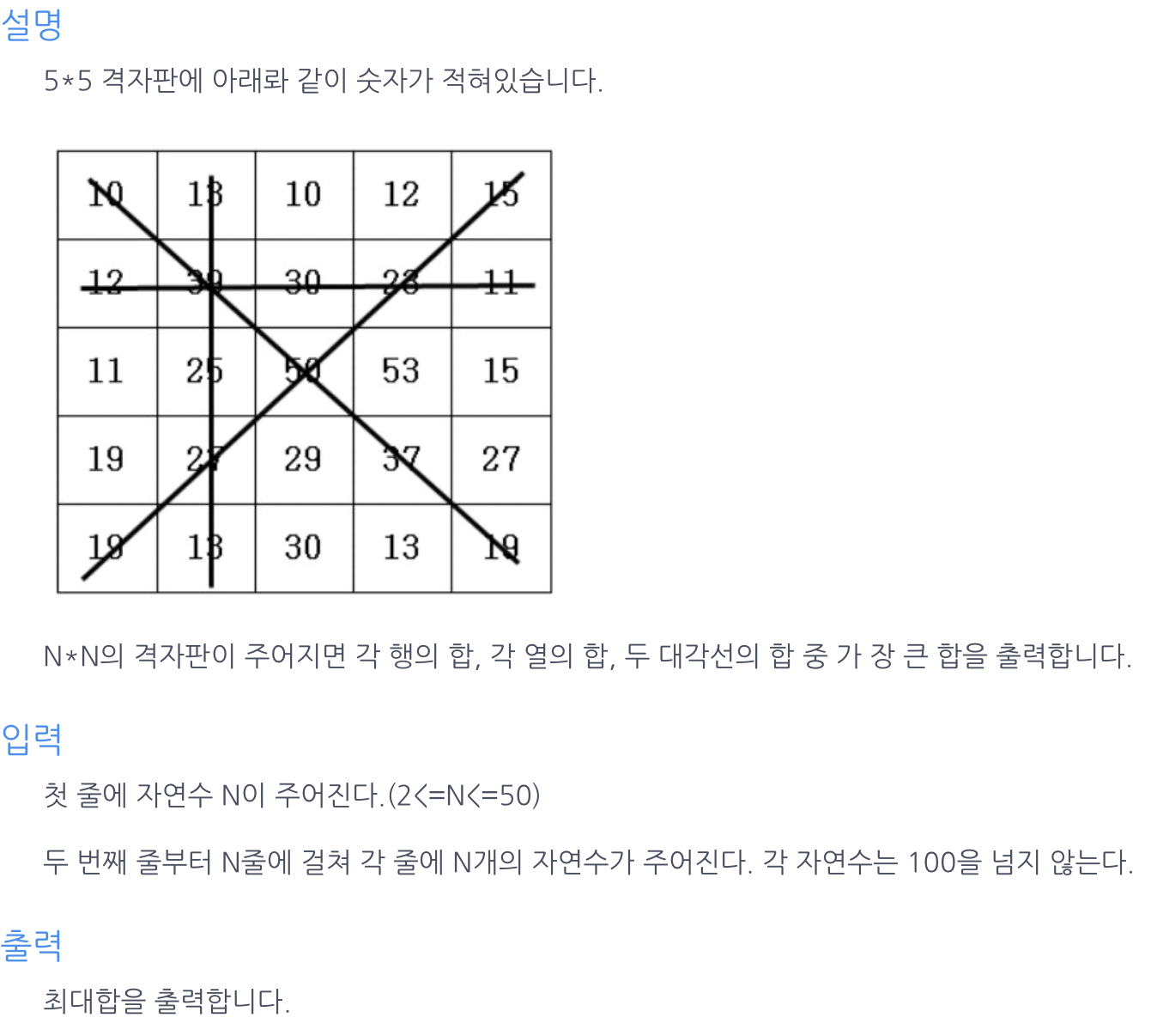 sum2+=arr[j][i]; // j๊ฐ ์ํ์ผ๋ i๊ฐ ๊ณ ์ ํฉ = ์ด์ ํฉ