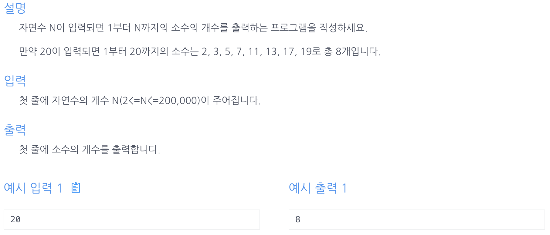 for(int i=2; i<=n; i++){ // ๊ฐ์ฅ ์์ ์์ 2๋ถํฐ ์์ํด์ ์์๋ฅผ count